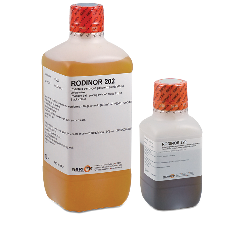 RODINOR 220 / 202 is a brilliant black bath rhodium plating process, easy to use and providing an hard uniform deposit. The line consists of concentrated solutions ready to use and all the replenishers for correct maintenance of the bath.